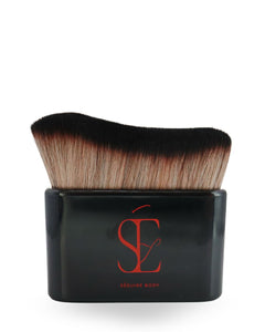 a photo of the body applicator brush applying our attention seeker bronzing shimmer oil on medium skin